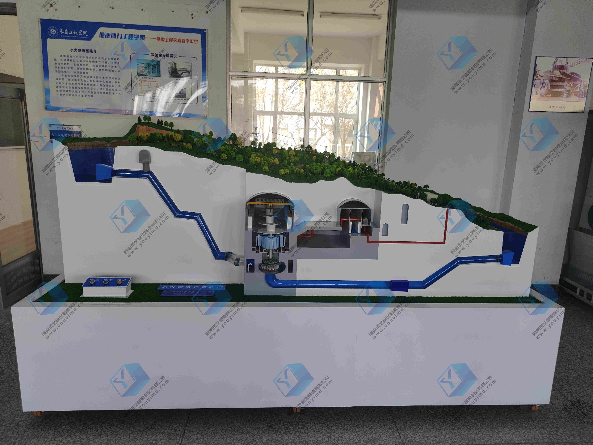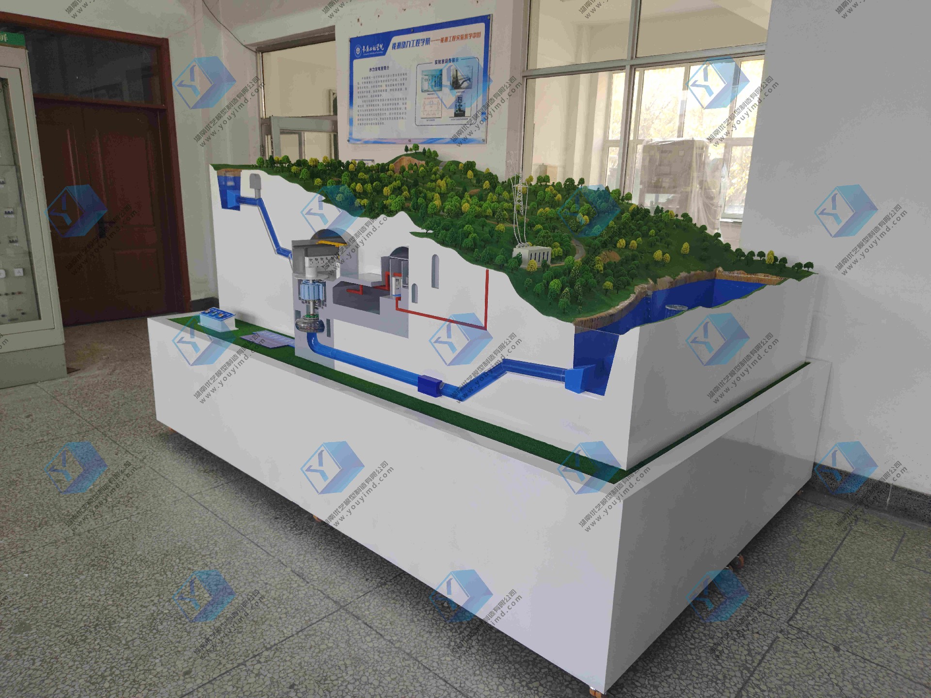 抽水蓄能水電站動態剖面結構仿真模型, 是湖南省優藝模型研發 、設計、制作的仿真教學實訓設備, 設備長 4米 寬1.2米。整體采用空面結構展示, 展示出上水位、 地下廠房、水輪發電機、下水位、 地面部分制作出山體地形綠化、鐵塔電能輸送線路等。 設備整體采用真實過水、 模擬進水管道、 渦殼尾水管等采用透明結構, 內部真實過水 和LED燈光動態模擬水流流向 、通過自控技術實現抽水原理演示、 發電原理演示、 實現水輪機正反轉、水流反向流動 、實現 抽水蓄能水電站工作原理動態演示。 適用于教學實訓科普展覽等