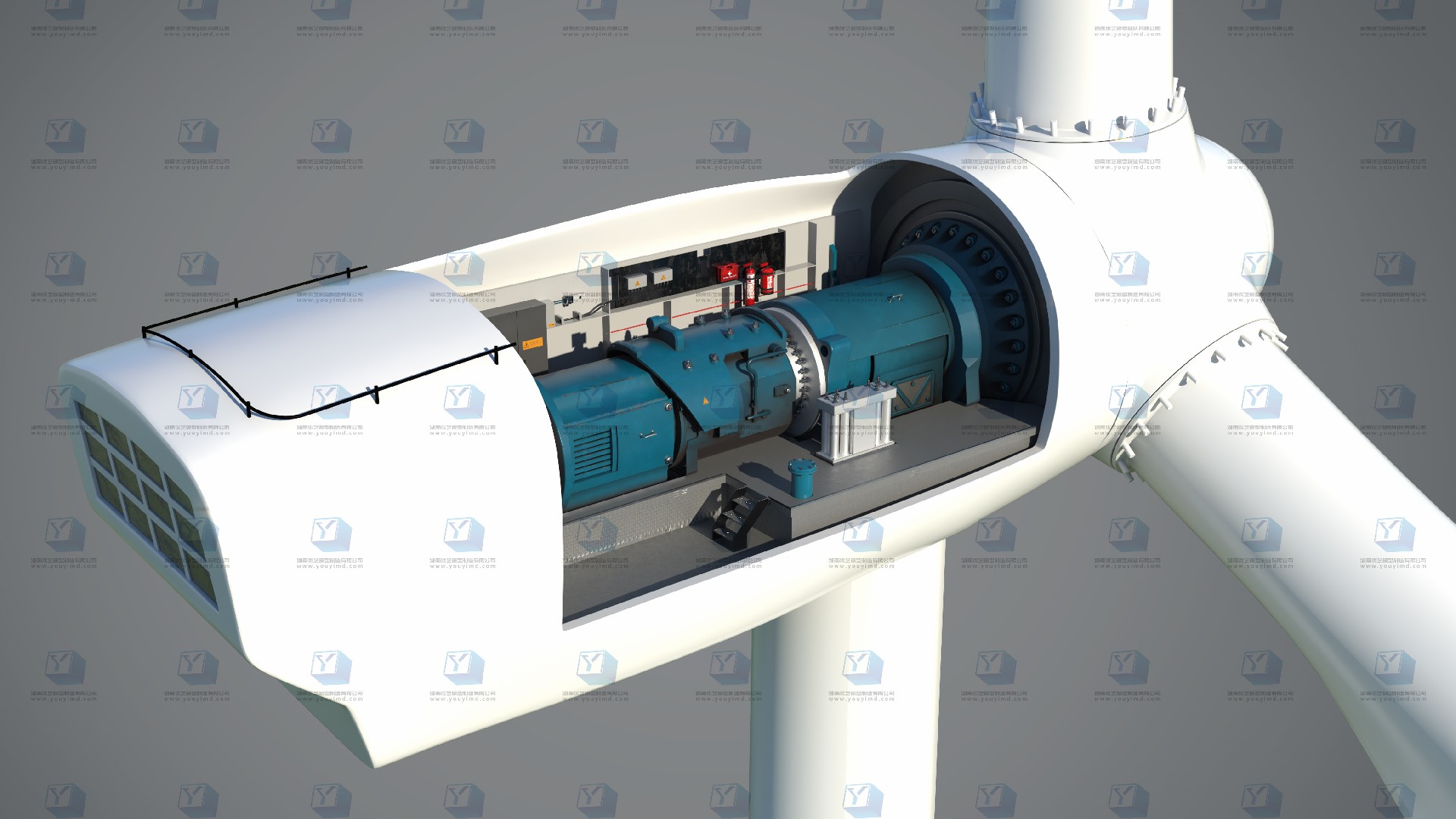 風機模型主要制作結構部件:導流罩、輪轂、葉片(截斷式展示)、塔架、機艙、機架,偏航電機、主軸承、齒輪增速箱、發電機、電器柜、控制柜、風向標、風速儀。以上部件皆為外形結構展示,可通過剖面機艙直觀觀看到