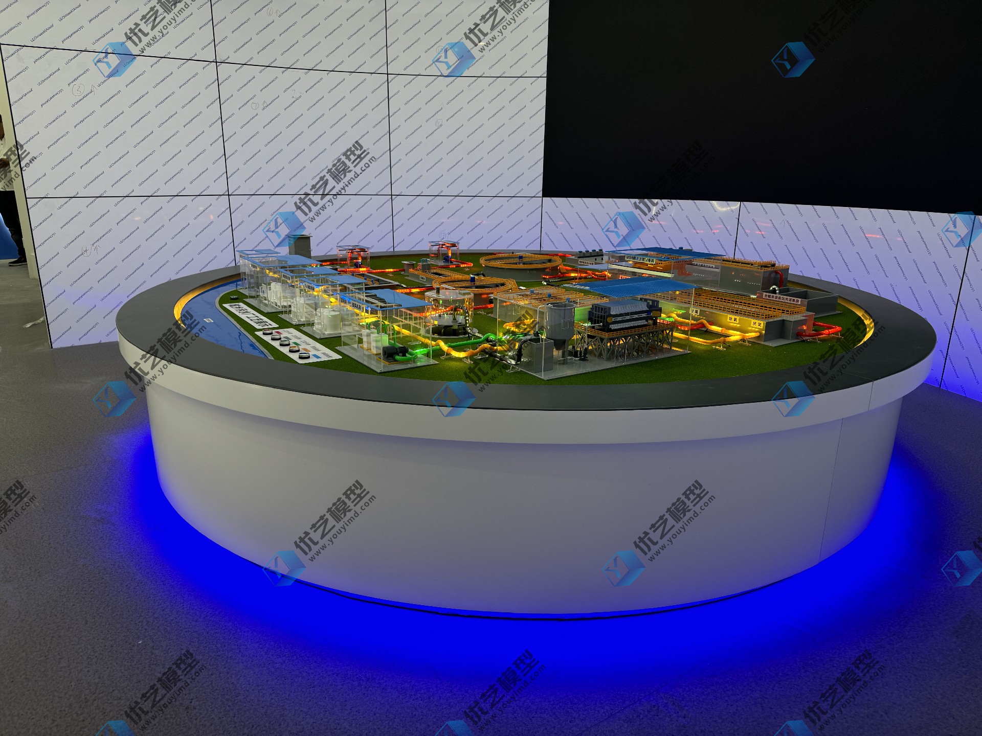 模型采用分色LED流星雨燈光系統(tǒng),動態(tài)模擬污水處理的各種介質流動工藝。這種獨特的照明方式不僅增加了模型的觀賞性,也提高了教育和展示的效果。各種顏色的燈光代表不同的流程: