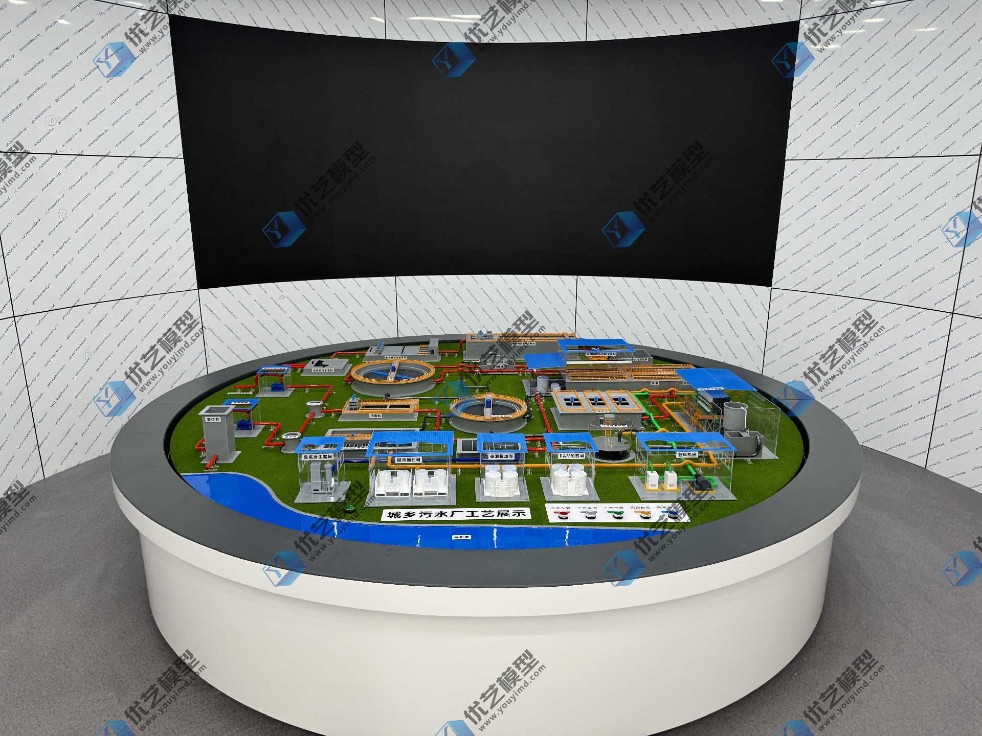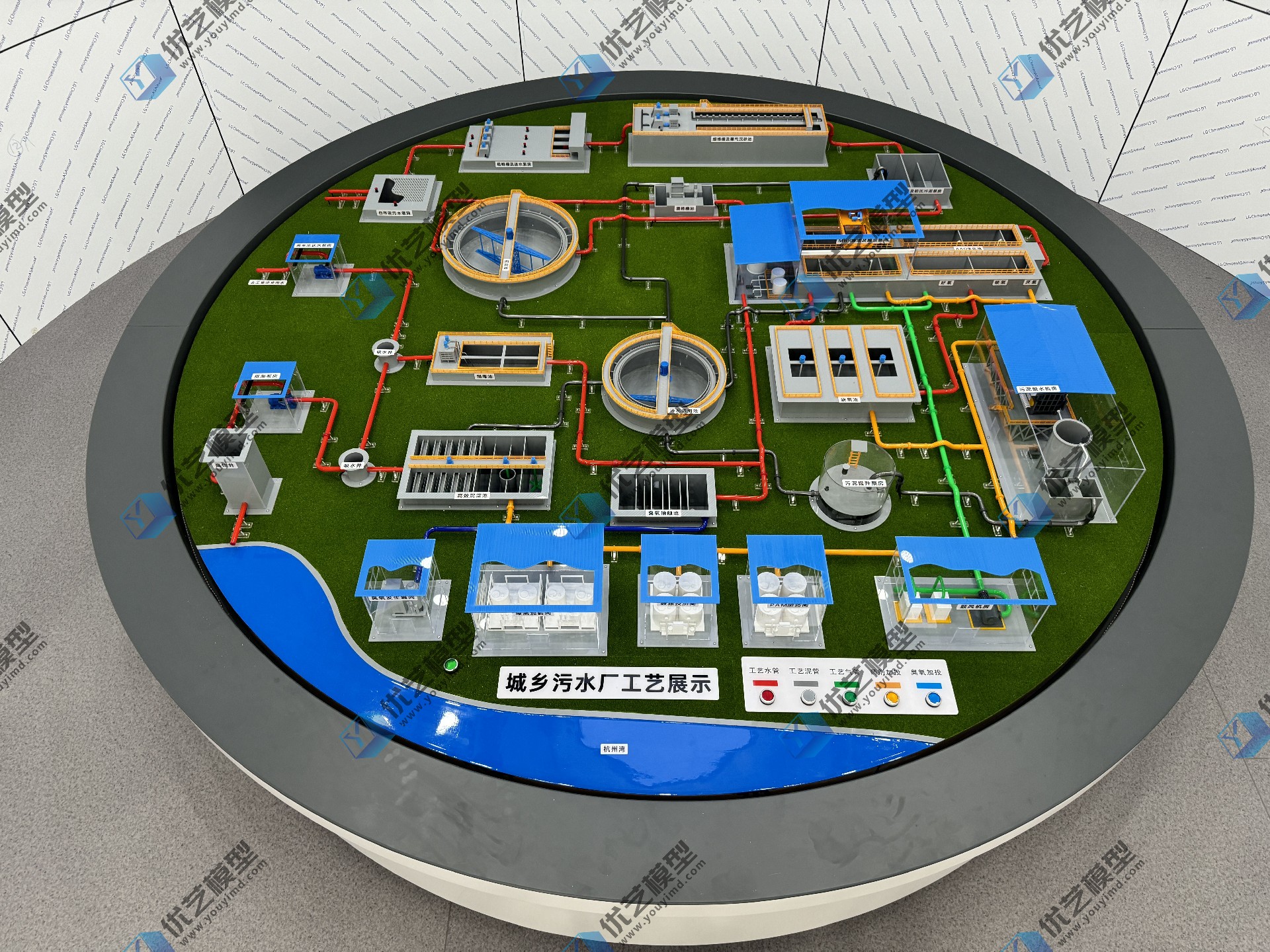 污水處理廠結構與工藝流程動態(tài)仿真模型,是湖南省優(yōu)藝模型根據(jù)業(yè)主圖紙定制設備,這套模型基于業(yè)主提供的圖紙定制,直徑達3米,旨在詳細展示污水處理廠內(nèi)各種關鍵設施的結構和功能。模型包括多個關鍵組成部分,如格柵、曝氣沉砂池、沉淀池、污泥濃縮池、臭氧接觸池和加藥間等,每個部分都采用高精度制作,確保結構細節(jié)的真實呈現(xiàn)