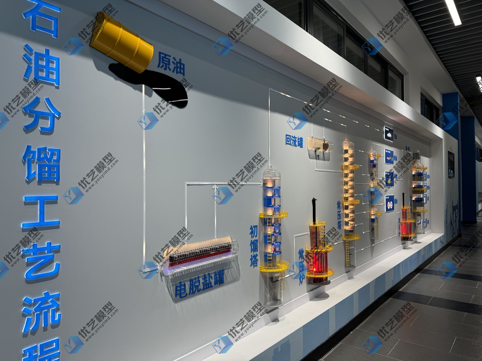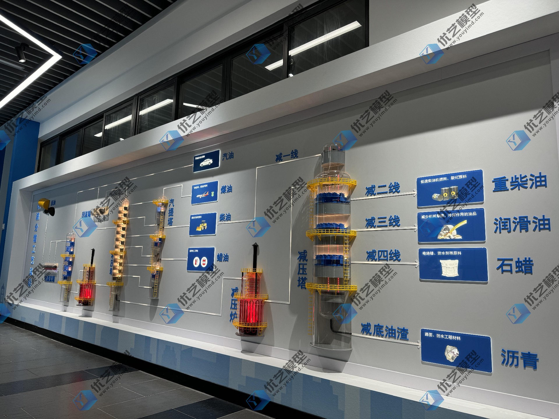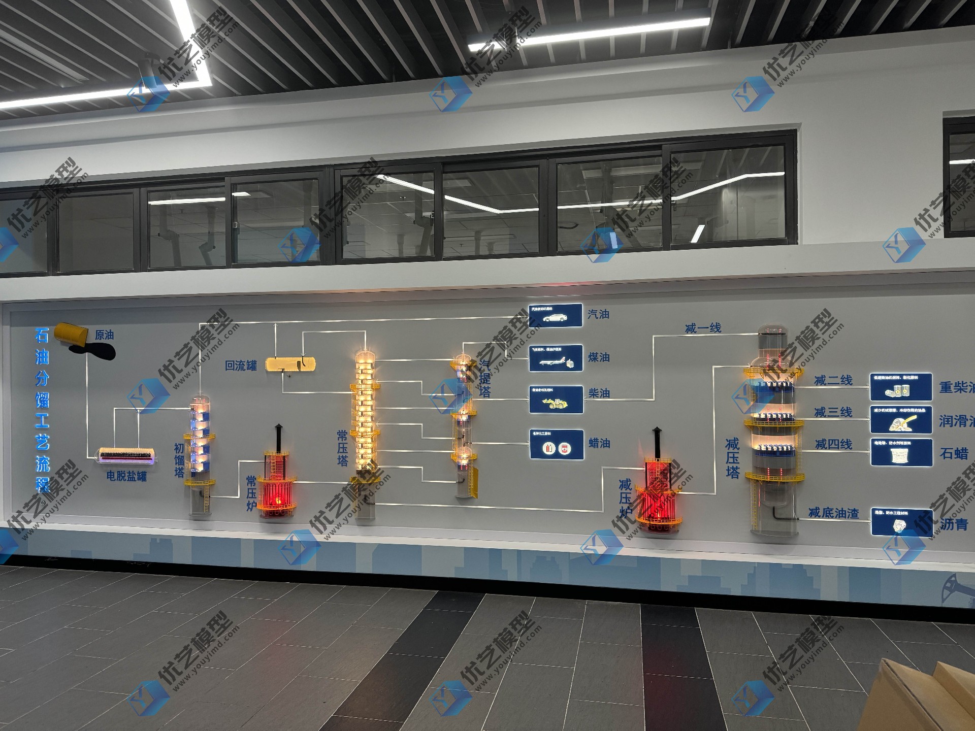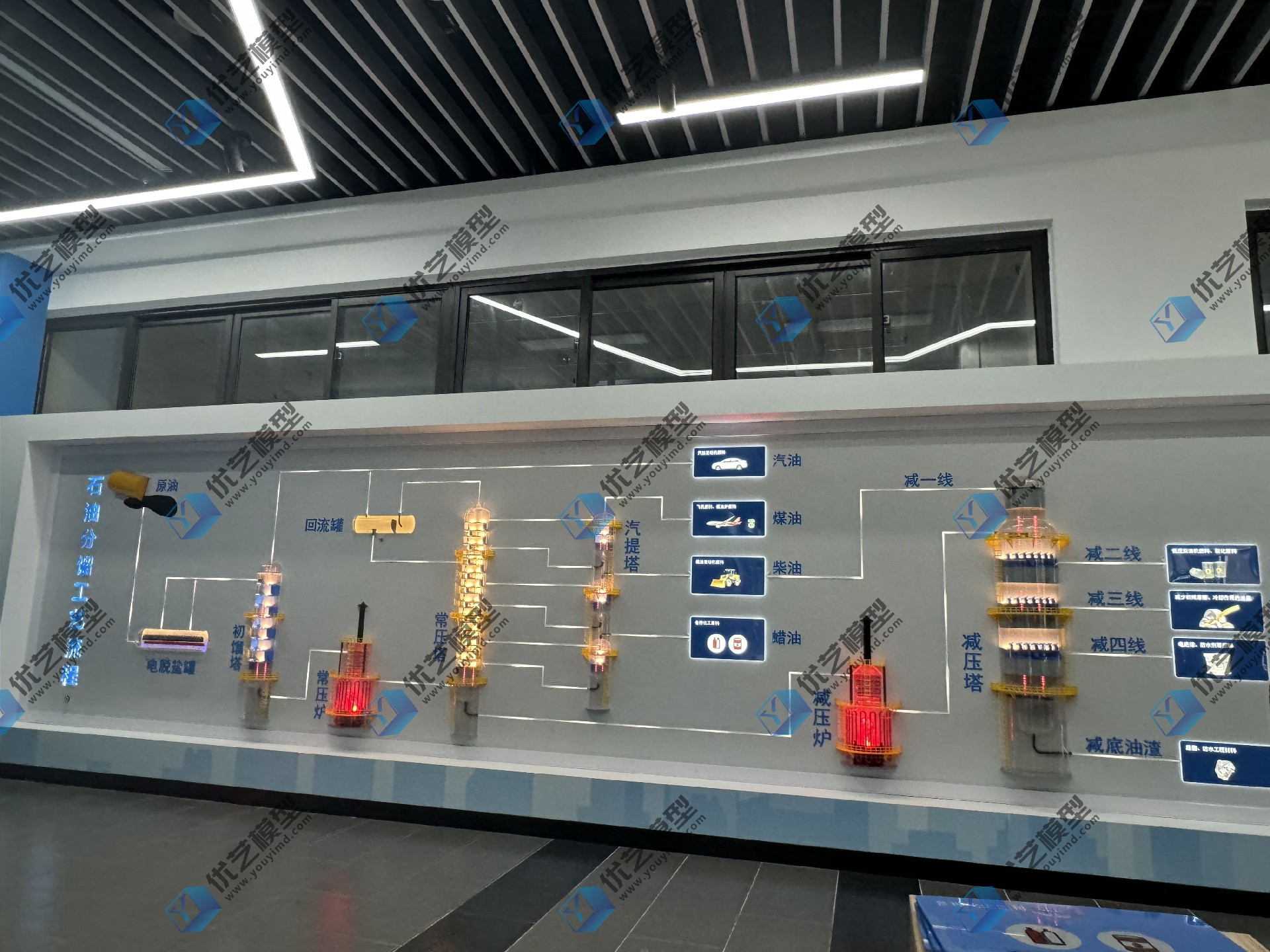 石油分餾全流程大型透明教學模型!由湖南優藝模型匠心打造,全長6.8米的立體裝置清晰還原原油到成品油的蛻變之旅。模型采用半剖透明設計,配合流動LED光效動態展示——從電脫鹽預處理、初餾提純,到常壓爐加熱分層、減壓塔精密分離,完整呈現原油通過不同沸點分離出柴油、煤油等組分核心原理。精準復刻真實煉化設備,常壓塔與減壓塔聯動演示。無論是高校化工課堂,還是企業實訓基地的工藝流程科普,讓學習者直觀掌握石油煉制分離奧秘